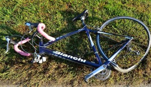 A few minutes later, the same thing happens. Hum. That’s strange. What’s going on? Then we hear an odd scraping noise and immediately pulled over. Turns out half my bike had slipped off the rack and was sliding down the freeway at 65 mph. Whoops.