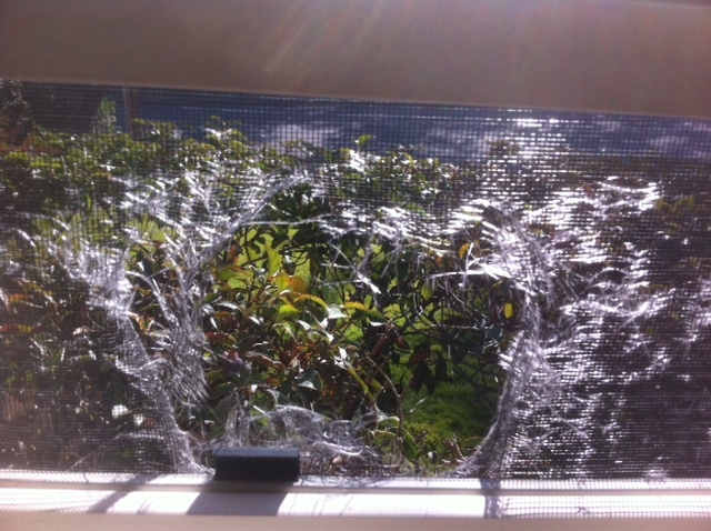 So once again I fill Penny’s food bowl then take it to my office to feed her.  As I step in, I notice she isn’t waiting for me at the door. Instead, there’s a gaping hole in the window screen and Penny has vanished.