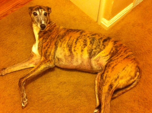 As I’m plating Penny’s food, the phone rings, so I answer it. When I turn back moments later, I see that Penny’s bowl on the counter is licked clean. Turns out Nellie, my Greyhound, couldn’t resist the temptation. (I keep forgetting how tall she is!)