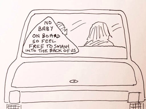 Question: What is it we’re supposed to do after reading a Baby on Board sign? Do they think we’ll come upon them and say, “Wow, there’s a baby in that car! I guess ramming them from behind isn’t a good idea after all. And here I had my heart set on it.”