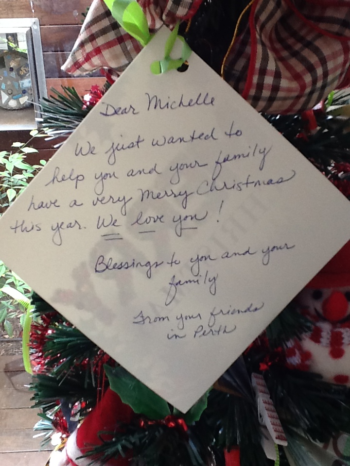There’s no way Sharon could hear that message and not act upon it. In fact, she believes she received it for a reason, and I agree. At home in the US, her family always picked a few names off a Giving Tree, where recipients receive anonymous gifts. But since they don’t have that in Cottesloe, Sharon created her own.