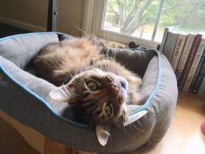 gimme that catnip!Ned sleeps in a bed on my desk next to the window and spends his days in blissful contentment, snoozing and watching the happenings outside. He’s no longer cold, hungry or scared. He relishes the good life, evidenced by his relaxed body language. Ned even sits on my lap now and lets me pet his belly. How awesome is that?