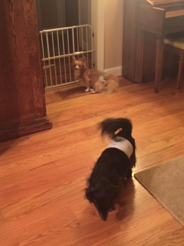 Skip grooming Callie. My 2 diaperless pupsIn my defense, Wally and Taffy were rescues who I suspect had bathroom issues prior to gullible me believing the check mark in the box on their surrender forms asking their guardians, “Is your dog potty trained?” Boy did I fall for that one.