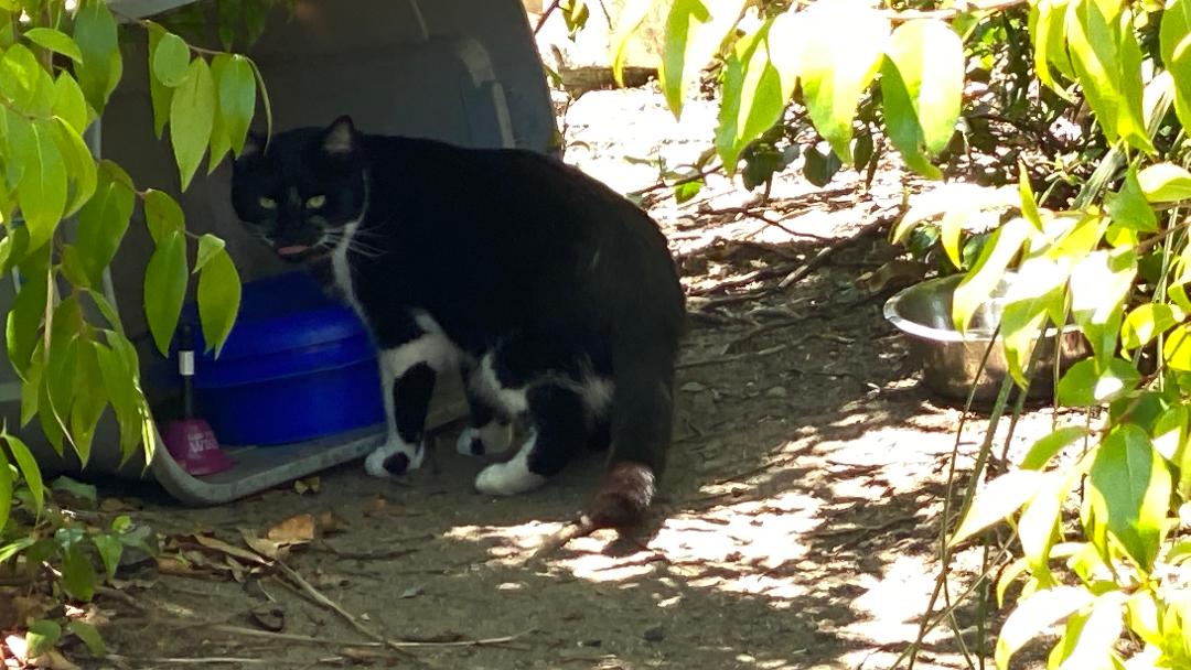 The next morning I wondered why I still hadn’t heard from Lori. So I drove to the location hoping to see our new visitor. And there he was waiting for his breakfast. But when he saw me, he immediately took off. Evidently I’m not a cat whisperer like Shirin.