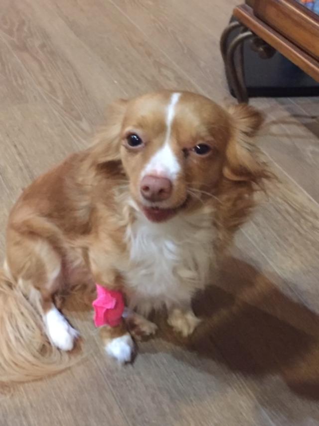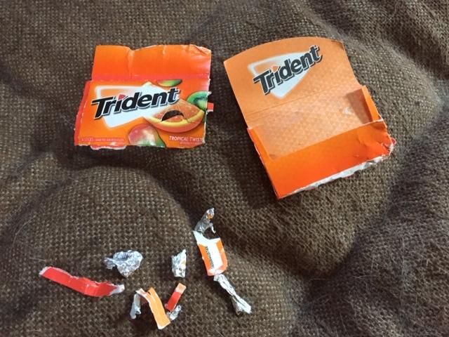 So Thursday night at about 8:30 I’m relaxing in my favorite chair, feet propped up on the ottoman, when I decided to check on one of my foster cats. A couple minutes later I return to find my dog Taffy munching something orange. I thought, what is that? That’s when I saw what was left of a pack of gum.