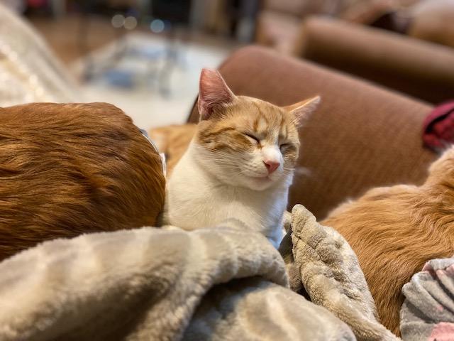 So now I have an even 10 in the four-legged department — 4 dogs and 6 cats. (Don’t tell anyone.) Seriously, when you have 9, what’s one more? Anyway, Mango has been slowly working her way into her new family. When I’m in my office, my lap is never empty. She purrs so much and so loud, perhaps I should have named her Pursey.