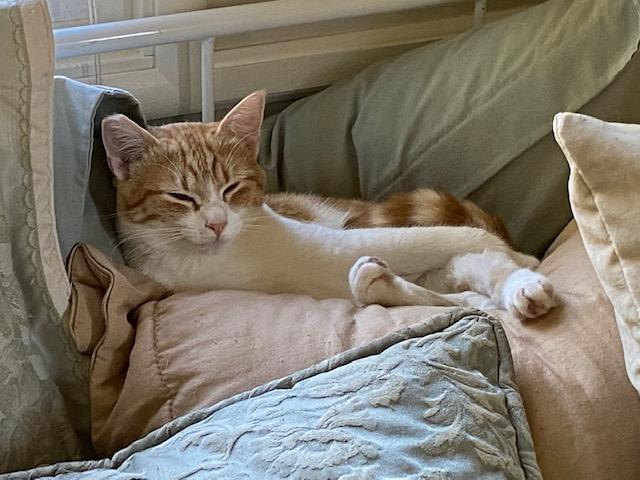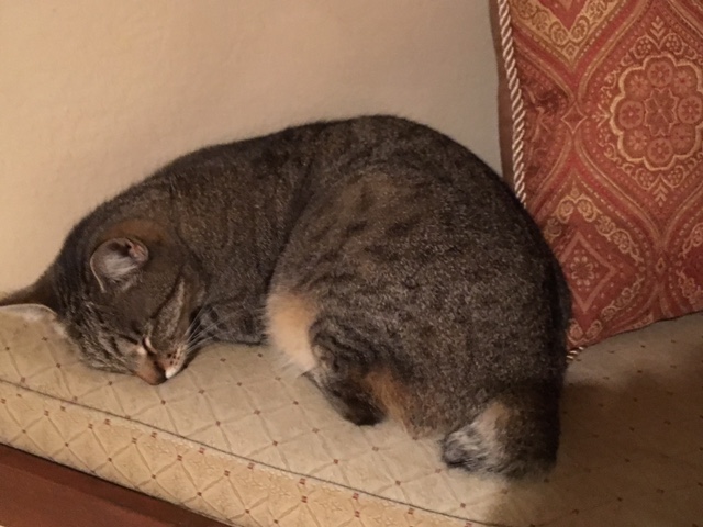 That leaves Mango, my newest addition and first domestic kitten. I’m still discovering her quirks but one is that she’s a glutton, just like Jack. Gotta watch that girl or I’ll have 2 tubbies in the mix. Mango cries the loudest and longest for her meals, then can’t wait to sneak food from the others. I love that she’s always in my lap when I’m in my office. Otherwise she’s the snoozing queen. I’m not even certain what color her eyes are, they’re closed so much.