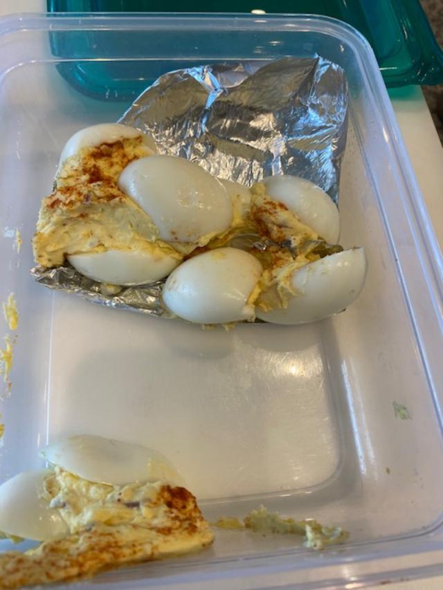 Then Karen arrived with her assignment of deviled eggs with Vienna sausage babies in them. I know, weird huh? Apparently it’s a thing. But after going through 3 dozen eggs, she ended up with just 1 dozen and only 2 containing sausage babies because they didn’t look how she wanted. Apparently I wasn’t the only one being challenged.