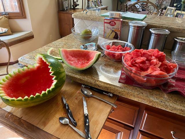 Guess what? I learned something the videos didn’t show. When scraping out the melon, expect a watermelon bath to ensue. My face was practically dripping with juice so I wore my pandemic mask. Problem solved.
