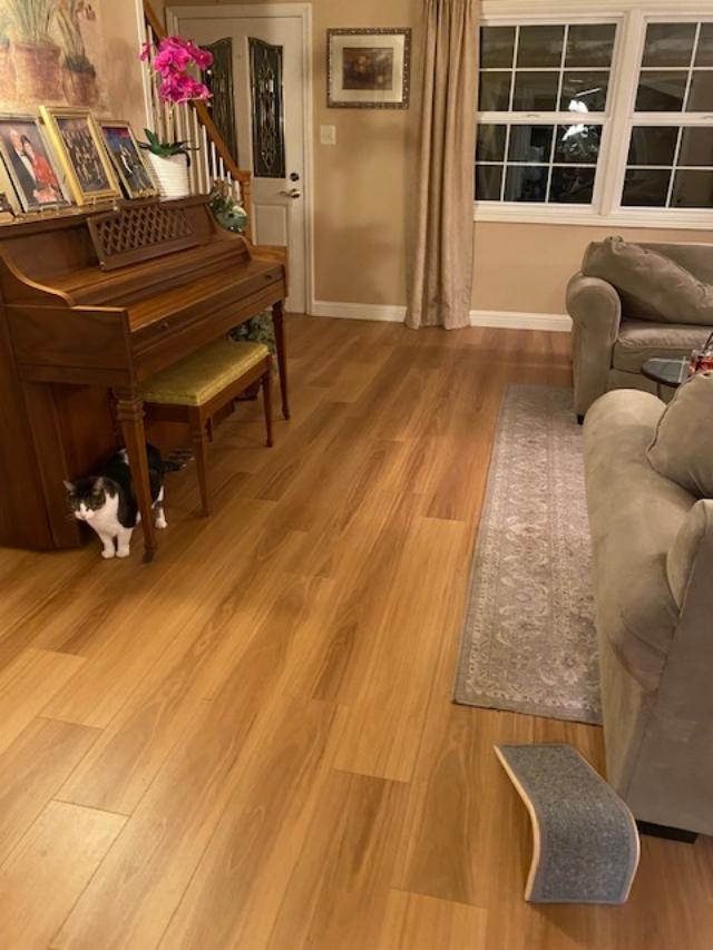 It took 3 days to complete the dining room, living room, hallway and 2 bedrooms but the noise was so loud my 6 cats became ghosts. The scaredy cats only emerged at dinnertime, albeit cautiously. Even Callie hesitated to come downstairs. I assured her the flooring isn’t as slippery as hardwood but she didn’t believe me. I had to use my bribing skills to coax her down with her favorite treats.