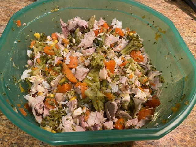 Now don’t get me wrong; it’s actually much simpler than I imagined and I wish I’d started long ago. Skip, Wally and Taffy now can’t wait to eat, or should I say scarf like boot camp trainees who are given mere minutes to eat. I actually timed Taffy the other night and it took her a mere 17 seconds to clean her bowl. My routine: 40% protein, 50% veggies that dogs can safely eat, 10% starches, then a probiotic and multivitamin stirred into their food.