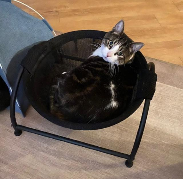 To wake me up, Jack sits on my chest. I assume he finds this endearing. To me, not so much. (I call him Fat Jack for a reason.) That guy can lie in the sun for much of the day, soaking up the rays with not a care in the world. I’m envious of his laziness. He only moves faster than a snail at meal time when I yell, “Nummers! Come and get it!” You can bet he’s always first to the kitty kitchen. Jack actually watches TV and is my only feline who loves the cat hammock.