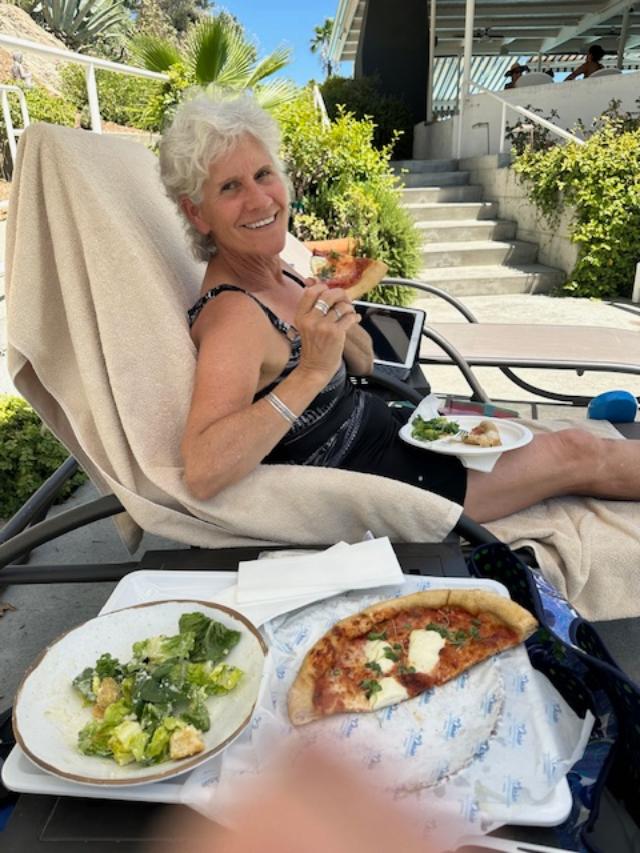 We did some reading, Sharon fell asleep, I started writing this blog post, and we ordered pizza and Caesar salad to eat pool-side. We skipped the cocktails so as not to make fools of ourselves drinking in the hot sun. Yes, it’s true — with age comes wisdom.