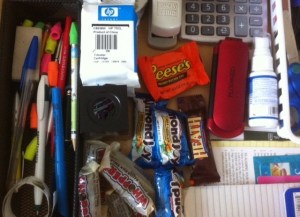 No, I’m quite open with my addiction. My candy stash is usually within easy reach of wherever I’m sitting at the time. For instance, if you dig through my glove compartment, you’ll most likely encounter sweets resting on my tire gauge.