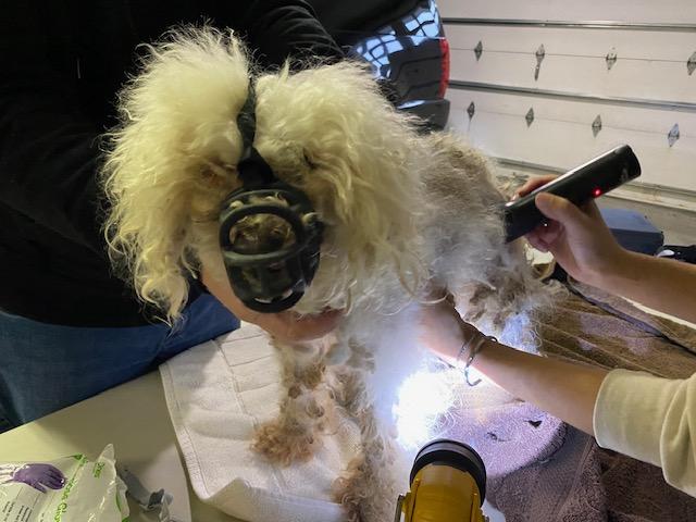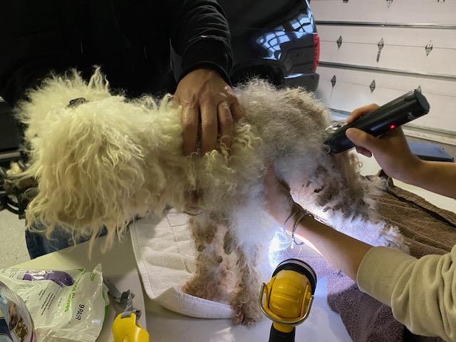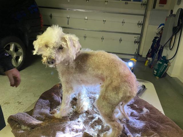 On the way to his house, Kevin called a friend who does dog grooming. She met us in his garage where Sadie received what was likely her first haircut. It was a tedious process trying to cut through a mass of matted fur. Ultimately, Sadie needed to be shaved nearly bald but she was a trooper through it all. What a sweetheart.