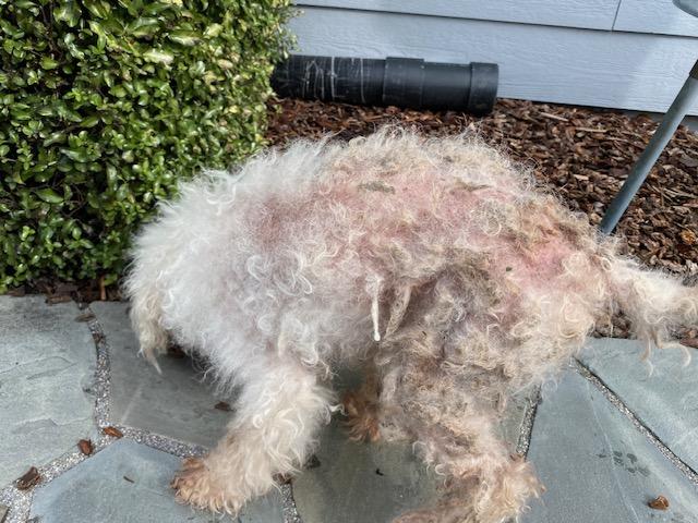 We were called about a horribly neglected dog who lived in a pint-size, cemented backyard. According to a neighbor, Sadie was alone day and night, never allowed inside. When discovered, her fur was matted into dreadlocks. Fur had even grown into her mouth, like thick rope adhering to her gums. She couldn’t fully close her mouth or easily chew.