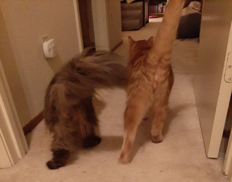 At about 8 months, OC came out from hiding, climbed onto Gina’s lap, and demanded full body pets. Gina’s cat, Lulu, also visited with him in his room and after about a year, OC headed downstairs to be with her. Lulu is blind so OC helps her on the stairs and leads her to her food dishes. Yep, he’s smitten with her.