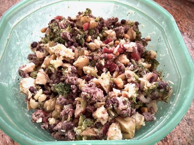 For example, last night they had hamburger, roasted potatoes in butter and olive oil, broccoli, tomatoes, black beans, and tofu. I sprinkle the bottom of their bowls with Zesty Paws 8-in-1 multi vitamin bites and then top their meal with a squirt of Omega-3 fish oil. I, on the other hand, had a vegetarian hot dog and a side of grapes. But I digress…