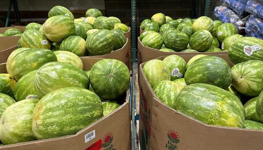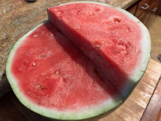 Anyway, when I spotted the particular Costco watermelon I wanted, it happened to be in a cardboard bin surrounded by other bins stacked on pallets. I gingerly walked on them until I reached my prize possession. Being able to reach down and lift that ginormous melon was a shocker since I’d pulled a muscle playing tennis that morning and bending over was not pleasant; but I had to have that watermelon.