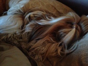 Lost Gizmo today. Searched the entire house, calling her in a panic. Finally found her spread-eagled on her back, sleeping behind sofa. Quite resembled Rod Stewart having a bad hair day. Seriously, what’s with that mop of hers?