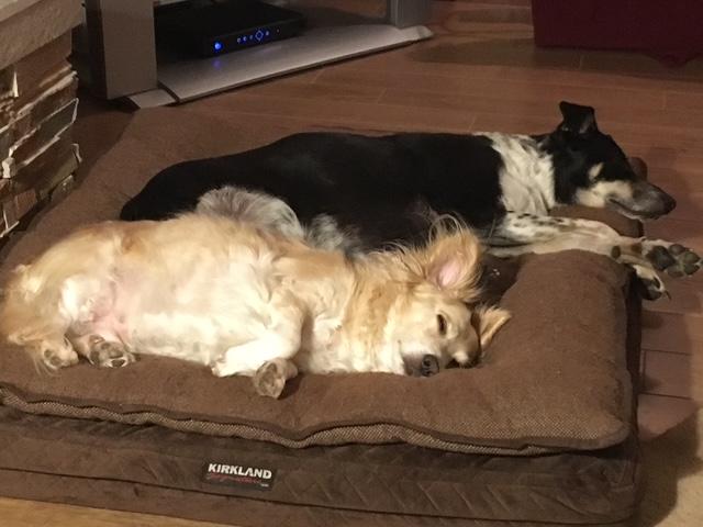 I snap Wally and Skip together while Skip barks madly, scratching at the newly painted door trim. When I finally open the door and tell them to wait, they actually do. I know, hard to believe. Then I say, Okay, let’s go! That’s when all hell breaks loose as they dash down the walkway, me in tow. Every. Single. Time. Rinse and repeat.