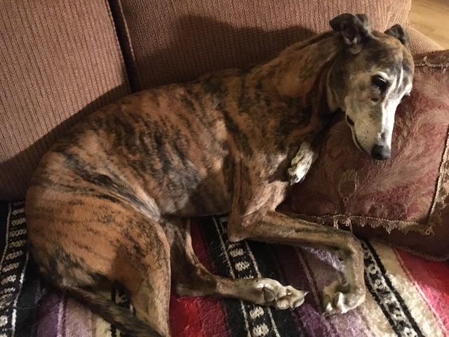 I yell at them to come back while trying to put Nellie’s special collar on her long neck. Hard to do with a squirming Greyhound. Then Callie’s collar is next. But in her excitement she ALWAYS runs to get a drink of water first, lapping it up like she’ll never drink again. So I wait. And I wait…