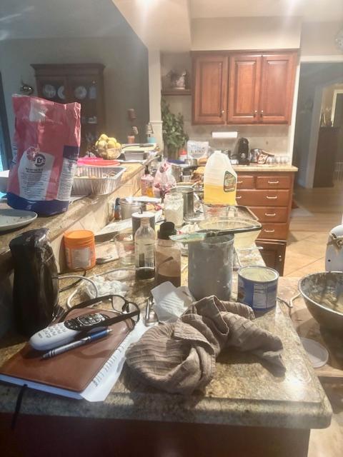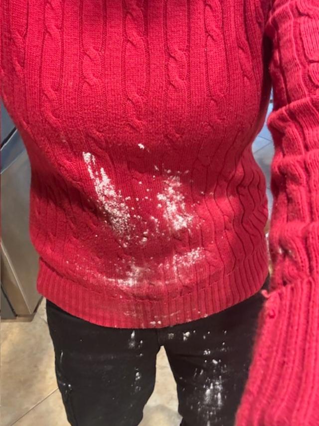 Third lesson: I’ve been baking for 50 years, so I know to go slow and low when mixing wet ingredients into flour. Unfortunately, being on the phone again is a messy distraction.