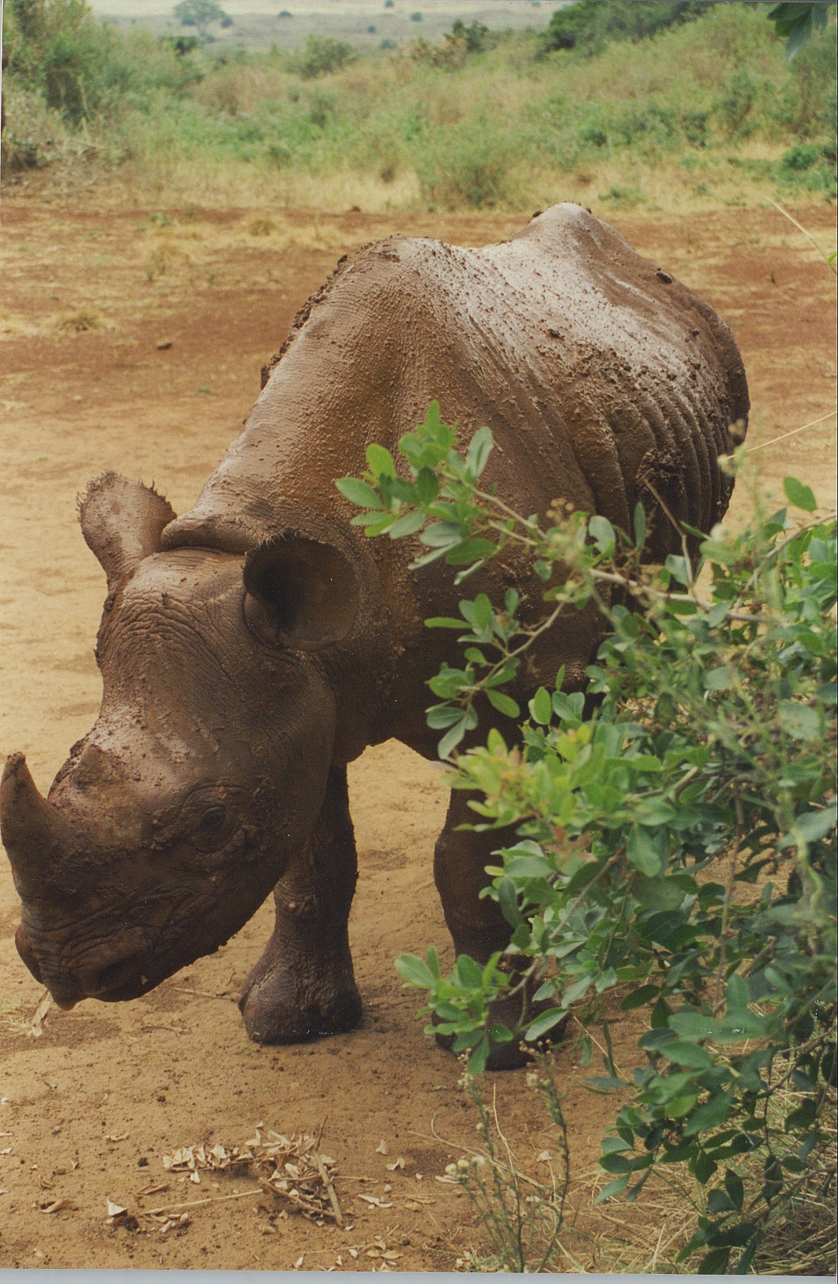 The 1500-pound babies at Sheldrick’s orphanage for African wildlife are Magnum and Magnette. In early 1997, the newborn Magnette was discovered separated from her mother. Magnum is the calf of Scud, a previously orphaned black rhino who was born in Nairobi National Park during the Gulf War.