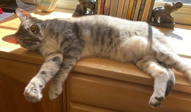 So let’s tackle Piper this week, shall we? She’s my latest cat rescue. When I fostered her and her sister, they were on the border of being beyond socializing at 4-months-old. Fortunately, her sister blossomed and was adopted. Piper, on the other hand, remained a scaredy cat — too young to relocate but too feral to be adopted. I thought, UH OH, here we go again. Meet my failed foster # 8.